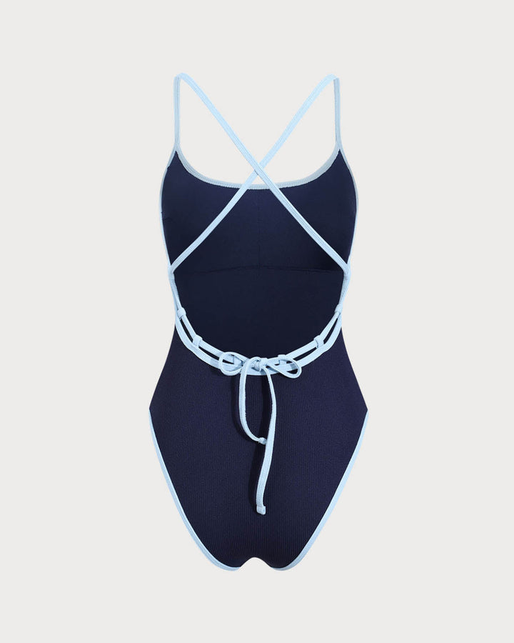 Mavi Kontrastlı Çapraz Bağcıklı Tek Parça Mayo