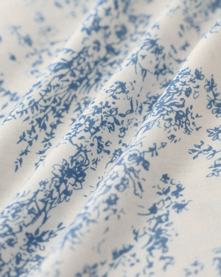 Narin mavi çiçek desenli bu elbise, vücudu saran kesimini vurgulayan büzgülü bir tasarıma sahiptir. Ayarlanabilir askıları ve slip stili hem rahatlık hem de kolaylık sağlarken, hafif kumaşı nefes alabilirlik sağlar.