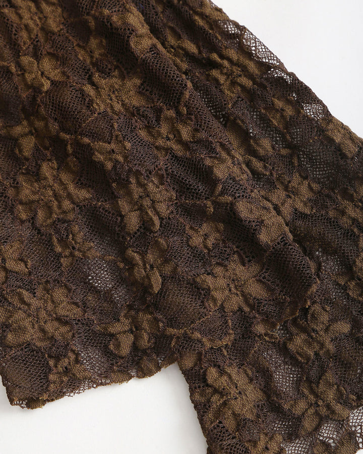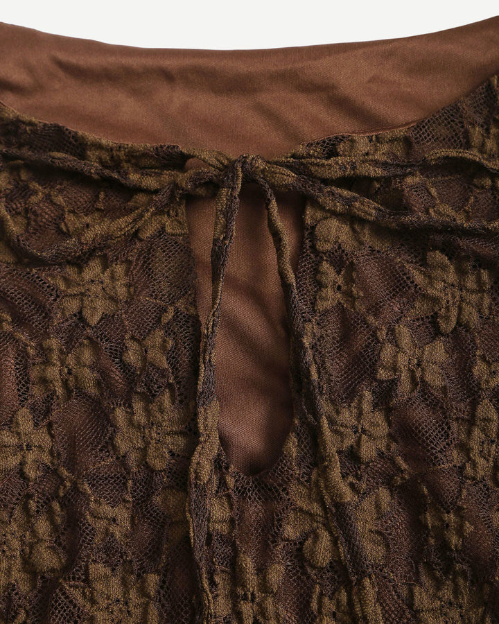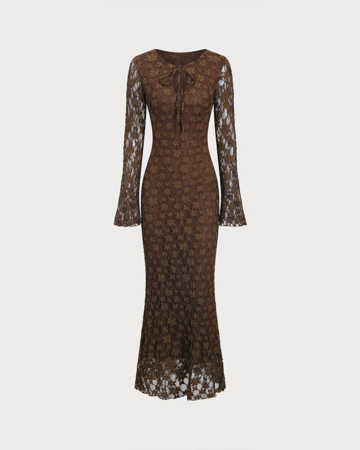 Kahverengi Çiçek Desenli Çan Kollu Maxi Elbise