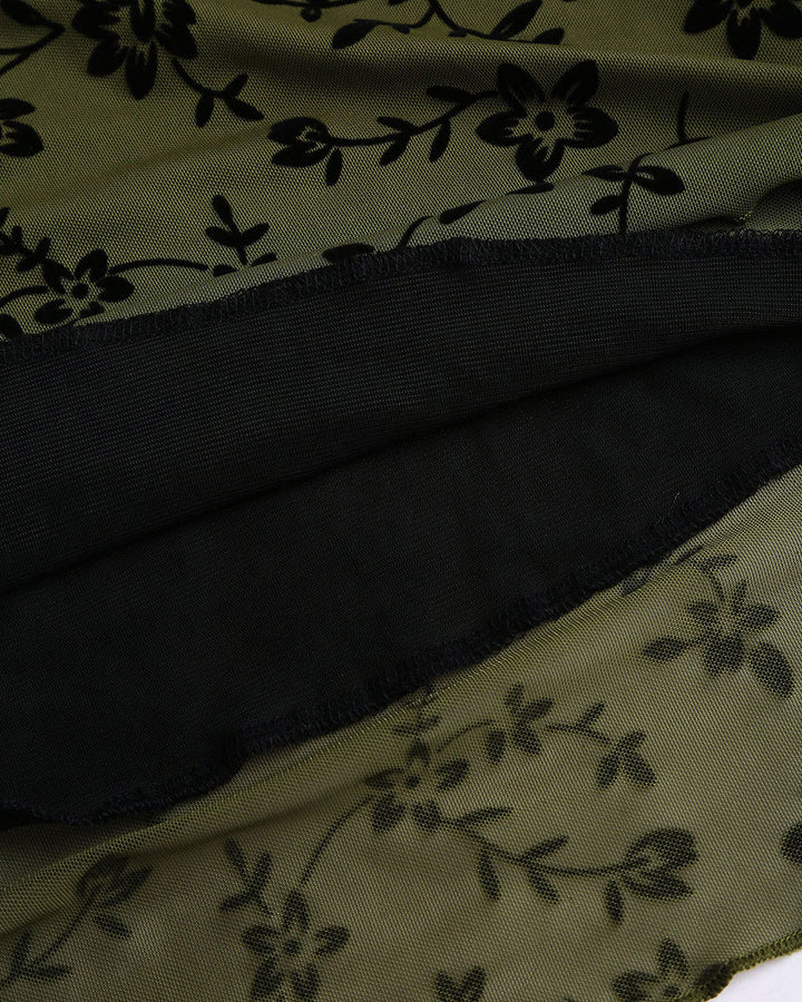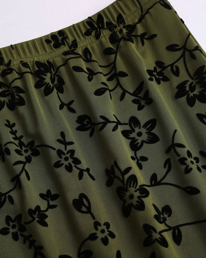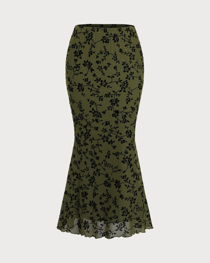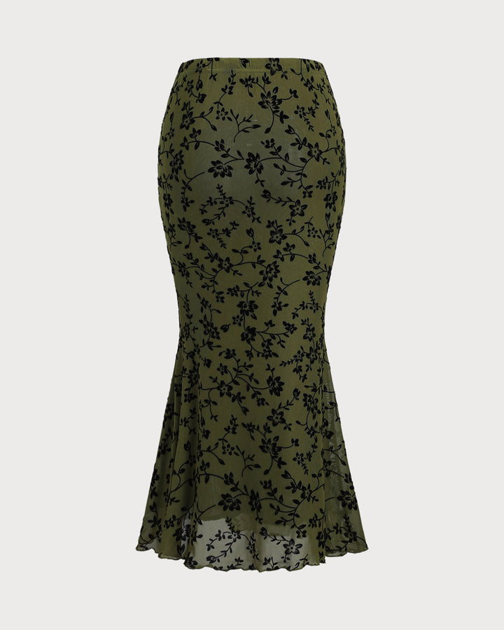 Yeşil Çiçek Desenli Elastik Bel Denizkızı Midi Etek