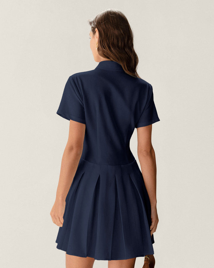Derin lacivert renkte tasarlanan bu elbise, hareket ve doku katan narin pilelerle yapılandırılmış ancak vücudu saran bir siluete sahiptir. Önü düğmeli olması klasik bir zarafet katarken, mini boyu modern ve şık bir görünüm sağlar.