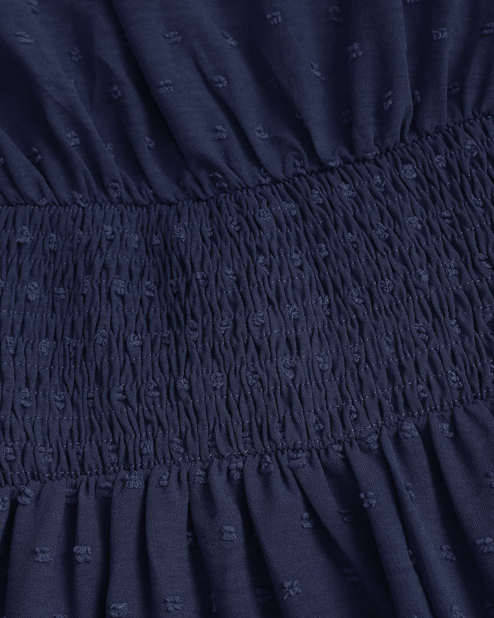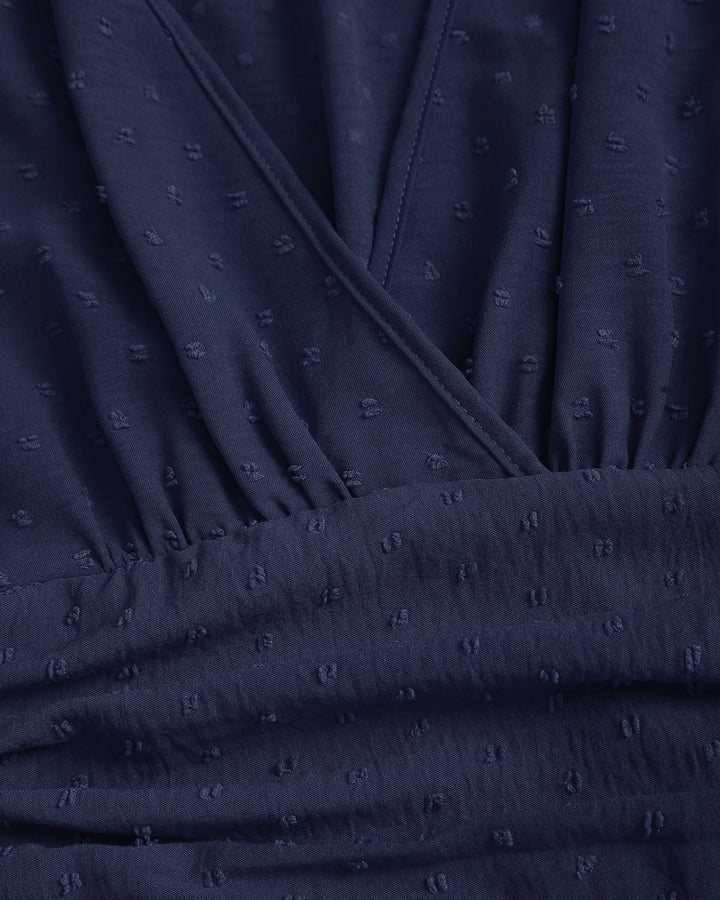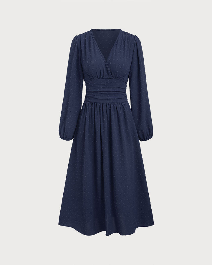 Lacivert Polka Dot Büzgülü Midi Elbise