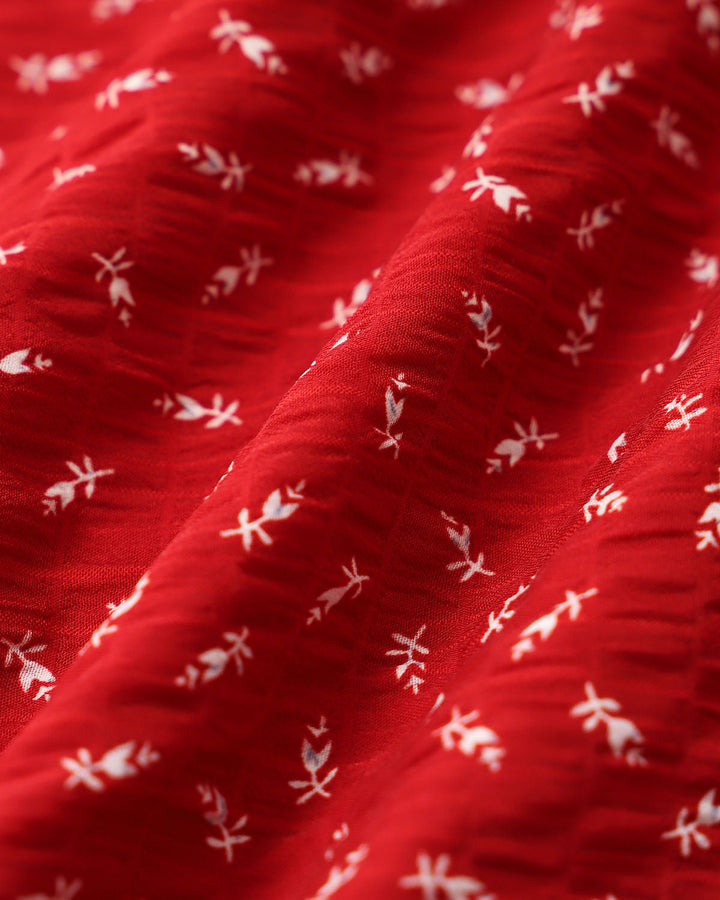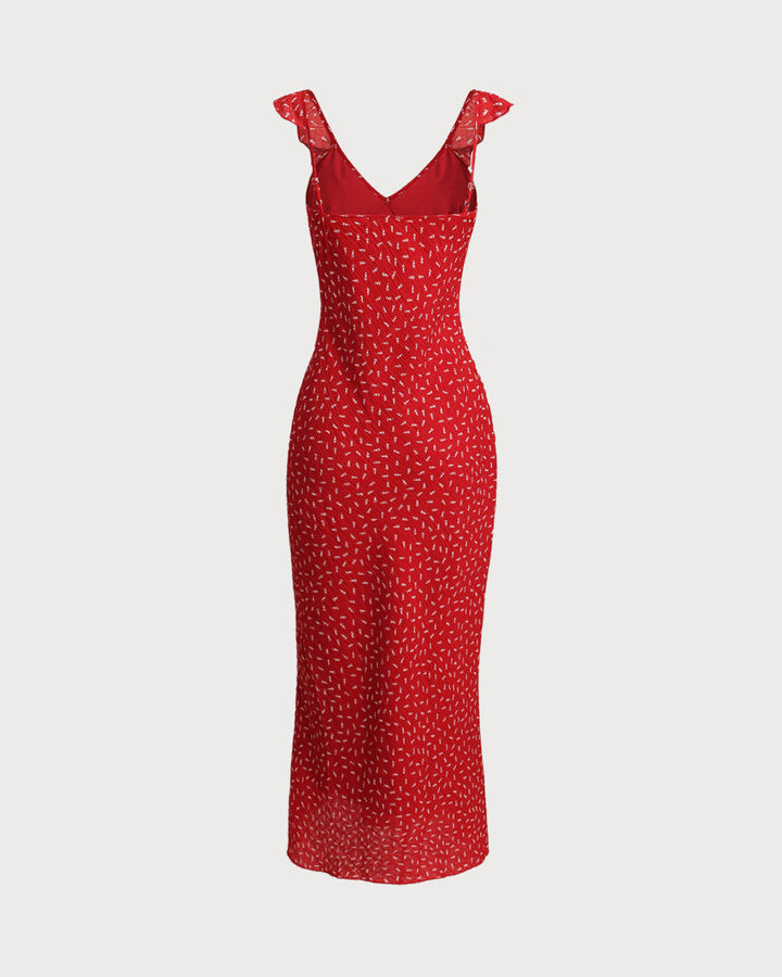 Kırmızı Çiçek Desenli V Yaka Fırfırlı Maxi Elbise