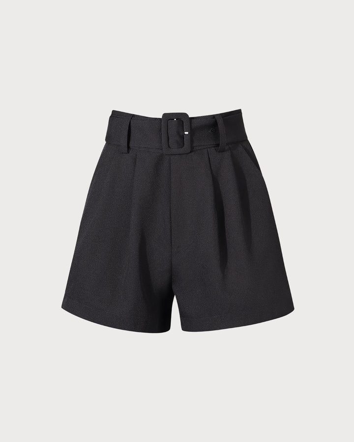 Siyah Yüksek Bel Pileli Kemerli Şort