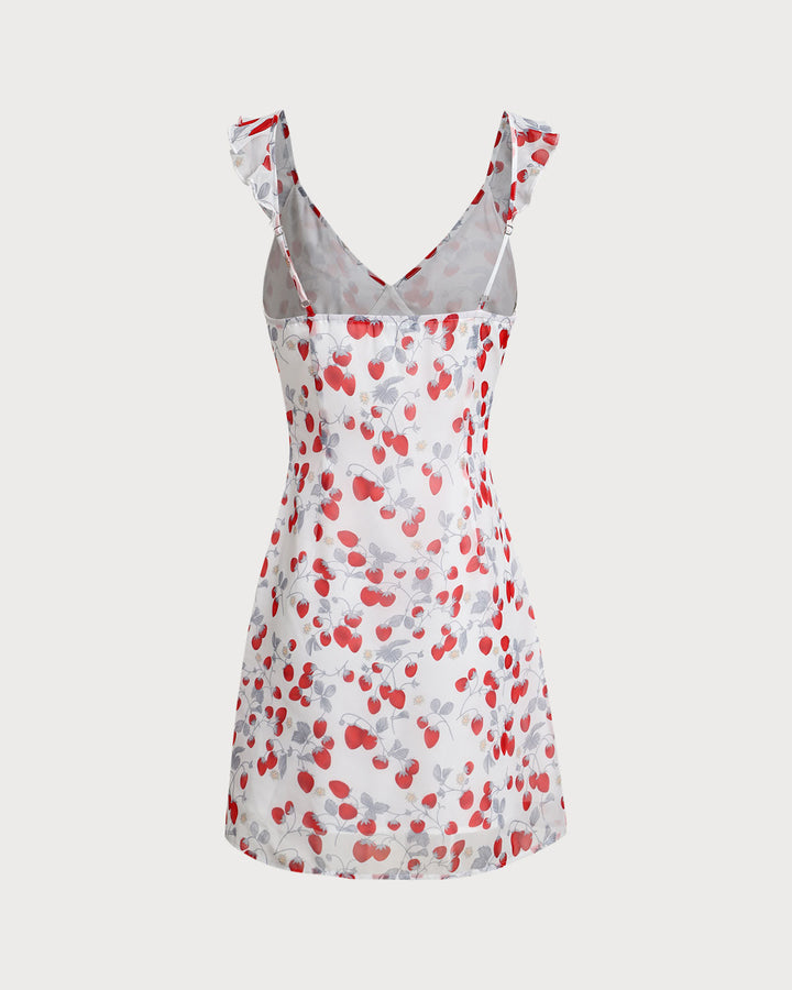 Beyaz Çiçek Desenli V Yaka Fırfırlı Mini Elbise