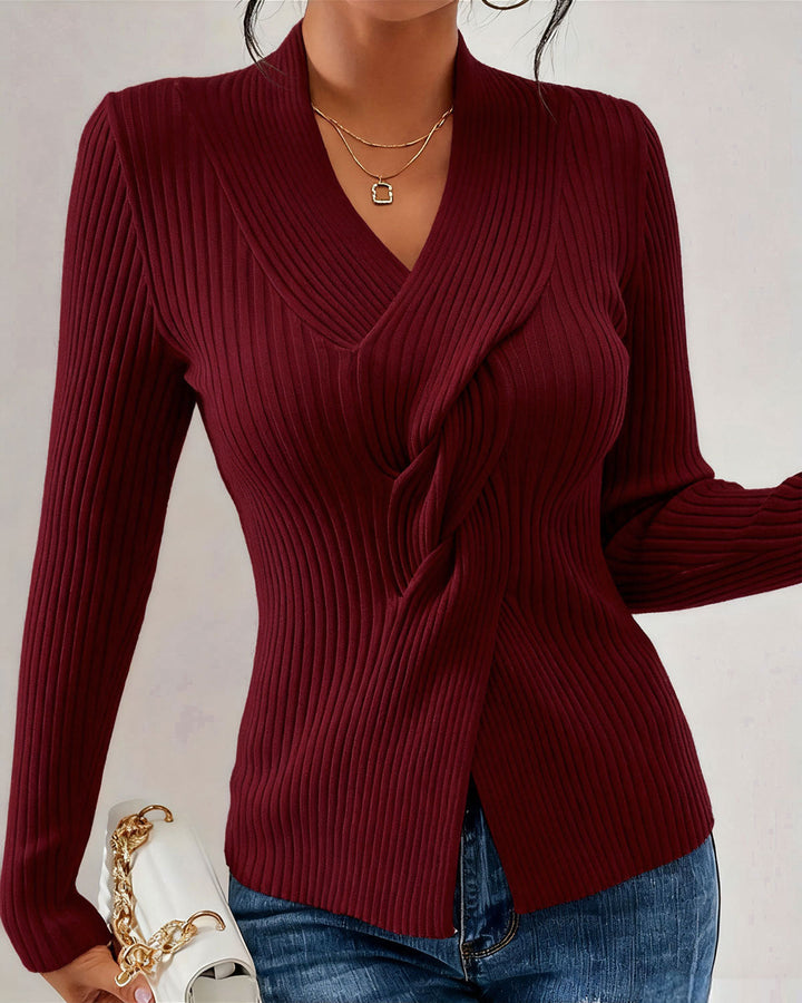 Şarap Kırmızısı V Yaka Bükümlü Örgü Kazak